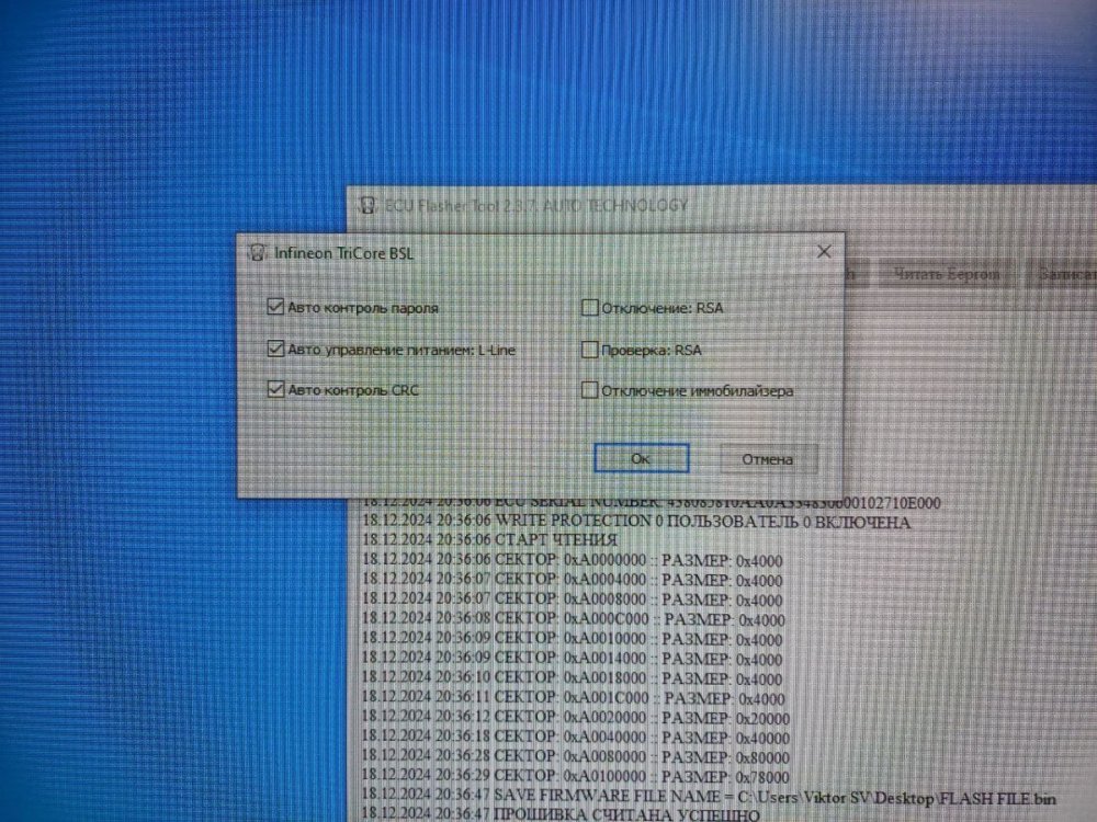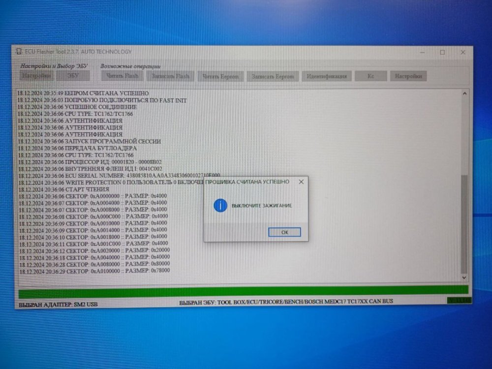 1 баллСпасибо за ответ. Пробовал читать AC Delco E83 принял как родного и прочитал блок. ) Буду тестировать дальше. 06.03.2025 18:20:06 Error ПРИЛОЖЕНИЕ ЗАПУЩЕНО 06.03.2025 18:20:06 Message НОМЕР ОБНОВЛЕНИЯ USB КЛЮЧА: 0xD 06.03.2025 18:20:06 Message НОМЕР USB КЛЮЧА: 9702075B95040E26 06.03.2025 18:20:06 Message SOFTWARE VERSION: 10.95 06.03.2025 18:20:06 Message FIRMWARE VERSION: 24 06.03.2025 18:20:08 Error АДАПТЕР НЕ ВЫБРАН 06.03.2025 18:20:13 Message ВЫБРАН АДАПТЕР: V200 06.03.2025 18:20:28 Message ВЫБРАН АДАПТЕР: V200 06.03.2025 18:20:29 Message API VERSION: 04.04 06.03.2025 18:20:29 Message DLL VERSION: 11:19:48 May 17 2024 V2.02.3 06.03.2025 18:20:29 Message FIRMWARE VERSION: Dec 12 2024 21:46:22 V1.30 06.03.2025 18:20:29 Message ВЫБРАН ЭБУ: ECU/Opel/Meriva/1.6/DELCO E83 MPC5565 2048kb CAN BUS 06.03.2025 18:20:45 Message ЧТЕНИЕ ИНФОРМАЦИИ: 06.03.2025 18:20:45 Message VIN: W0LPD6EB3BG085683 06.03.2025 18:20:45 Message HARDWARE PART NUMBER: яяяяяяяяя 06.03.2025 18:20:45 Message ENGINE: яяяяяяяяяяяяяяяяяяяя 06.03.2025 18:20:45 Message TESTER CODE: *37PHHD 06.03.2025 18:20:45 Message PROG DATE: 20110211 06.03.2025 18:20:45 Message DIAGNOSTIC IDENTIFIER: 180C 06.03.2025 18:20:45 Message SOFTWARE PART NUMBER: 86AATS56103800DV 06.03.2025 18:20:45 Message IDENTIFIED SLAVE SYSTEMS: 12639834 06.03.2025 18:20:45 Message IDENTIFIED SLAVE SYSTEMS: 55578457 06.03.2025 18:20:45 Message IDENTIFIED SLAVE SYSTEMS: 55578449 06.03.2025 18:20:45 Message IDENTIFIED SLAVE SYSTEMS: 55578465 06.03.2025 18:20:45 Message IDENTIFIED SLAVE SYSTEMS: 55582321 06.03.2025 18:20:45 Message IDENTIFIED SLAVE SYSTEMS: 55582319 06.03.2025 18:20:45 Message IDENTIFIED SLAVE SYSTEMS: 12633709 06.03.2025 18:20:45 Message IDENTIFIED SLAVE SYSTEMS: 55578440 06.03.2025 18:20:45 Message IDENTIFIED SLAVE SYSTEMS: 12639891 06.03.2025 18:20:45 Message IDENTIFIED SLAVE SYSTEMS: 12593927 06.03.2025 18:22:01 Message АУТЕНТИФИКАЦИЯ 06.03.2025 18:22:02 Message ОТПРАВЛЕН КЛЮЧ 06.03.2025 18:22:02 Message СТАРТ ЧТЕНИЯ 06.03.2025 18:23:20 Message СТАРТ ЧТЕНИЯ 06.03.2025 19:16:00 Message SAVE FIRMWARE FILE NAME = C:\Users\Viktor SV\Desktop\FLASH FILE.bin 06.03.2025 19:16:00 Message ПРОШИВКА СЧИТАНА УСПЕШНО1 балл -
