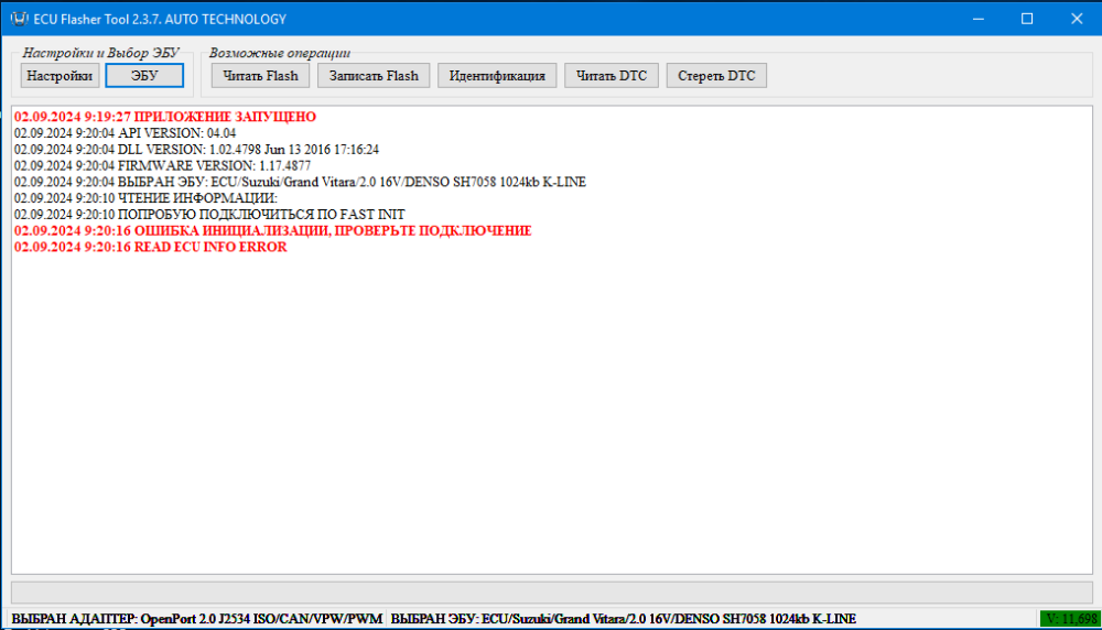 Добрый день. ECU flasher пишет ошибка инициализации. С программой SZ viwer A1 подключается log_2024.09.01.txt