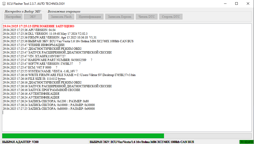 Спасибо за ответ. Пробовал читать AC Delco E83 принял как родного и прочитал блок. ) Буду тестировать дальше. 06.03.2025 18:20:06 Error ПРИЛОЖЕНИЕ ЗАПУЩЕНО 06.03.2025 18:20:06 Message НОМЕР ОБНОВЛЕНИЯ USB КЛЮЧА: 0xD 06.03.2025 18:20:06 Message НОМЕР USB КЛЮЧА: 9702075B95040E26 06.03.2025 18:20:06 Message SOFTWARE VERSION: 10.95 06.03.2025 18:20:06 Message FIRMWARE VERSION: 24 06.03.2025 18:20:08 Error АДАПТЕР НЕ ВЫБРАН 06.03.2025 18:20:13 Message ВЫБРАН АДАПТЕР: V200 06.03.2025 18:20:28 Message ВЫБРАН АДАПТЕР: V200 06.03.2025 18:20:29 Message API VERSION: 04.04 06.03.2025 18:20:29 Message DLL VERSION: 11:19:48 May 17 2024 V2.02.3 06.03.2025 18:20:29 Message FIRMWARE VERSION: Dec 12 2024 21:46:22 V1.30 06.03.2025 18:20:29 Message ВЫБРАН ЭБУ: ECU/Opel/Meriva/1.6/DELCO E83 MPC5565 2048kb CAN BUS 06.03.2025 18:20:45 Message ЧТЕНИЕ ИНФОРМАЦИИ: 06.03.2025 18:20:45 Message VIN: W0LPD6EB3BG085683 06.03.2025 18:20:45 Message HARDWARE PART NUMBER: яяяяяяяяя 06.03.2025 18:20:45 Message ENGINE: яяяяяяяяяяяяяяяяяяяя 06.03.2025 18:20:45 Message TESTER CODE: *37PHHD 06.03.2025 18:20:45 Message PROG DATE: 20110211 06.03.2025 18:20:45 Message DIAGNOSTIC IDENTIFIER: 180C 06.03.2025 18:20:45 Message SOFTWARE PART NUMBER: 86AATS56103800DV 06.03.2025 18:20:45 Message IDENTIFIED SLAVE SYSTEMS: 12639834 06.03.2025 18:20:45 Message IDENTIFIED SLAVE SYSTEMS: 55578457 06.03.2025 18:20:45 Message IDENTIFIED SLAVE SYSTEMS: 55578449 06.03.2025 18:20:45 Message IDENTIFIED SLAVE SYSTEMS: 55578465 06.03.2025 18:20:45 Message IDENTIFIED SLAVE SYSTEMS: 55582321 06.03.2025 18:20:45 Message IDENTIFIED SLAVE SYSTEMS: 55582319 06.03.2025 18:20:45 Message IDENTIFIED SLAVE SYSTEMS: 12633709 06.03.2025 18:20:45 Message IDENTIFIED SLAVE SYSTEMS: 55578440 06.03.2025 18:20:45 Message IDENTIFIED SLAVE SYSTEMS: 12639891 06.03.2025 18:20:45 Message IDENTIFIED SLAVE SYSTEMS: 12593927 06.03.2025 18:22:01 Message АУТЕНТИФИКАЦИЯ 06.03.2025 18:22:02 Message ОТПРАВЛЕН КЛЮЧ 06.03.2025 18:22:02 Message СТАРТ ЧТЕНИЯ 06.03.2025 18:23:20 Message СТАРТ ЧТЕНИЯ 06.03.2025 19:16:00 Message SAVE FIRMWARE FILE NAME = C:\Users\Viktor SV\Desktop\FLASH FILE.bin 06.03.2025 19:16:00 Message ПРОШИВКА СЧИТАНА УСПЕШНО